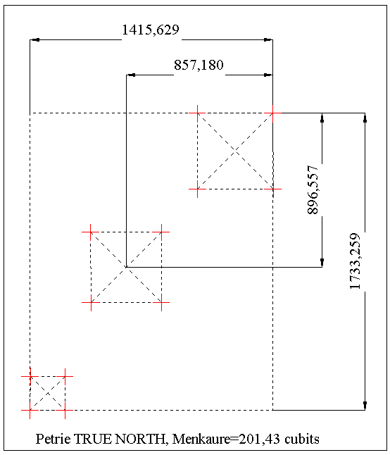 meters. Fig. 1, where dimensions are referred to a Coord. Syst. that sees Due North at + 4'52", or mean azimuth of 2 larger pyramids, is the plan accurately analyzed by John Legon, who firstly noted the geometry embedded into the Giza Complex. |