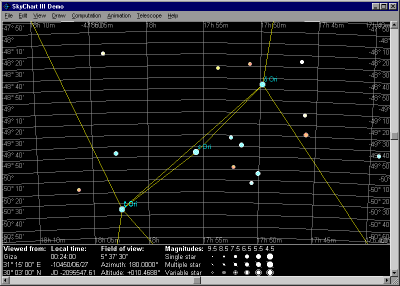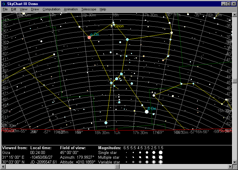 | Simulation of the sky at Giza, looking south, soon after midnight of June 27, 10450 BC, |