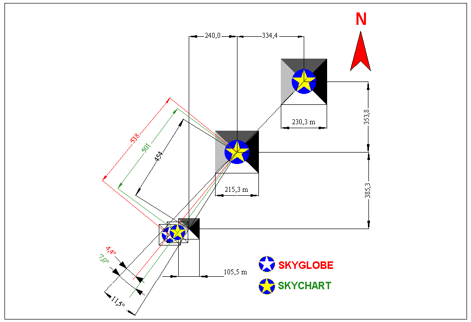 | Stars are superimposed to pyramids, regardless of their actual orientation in the sky. |
