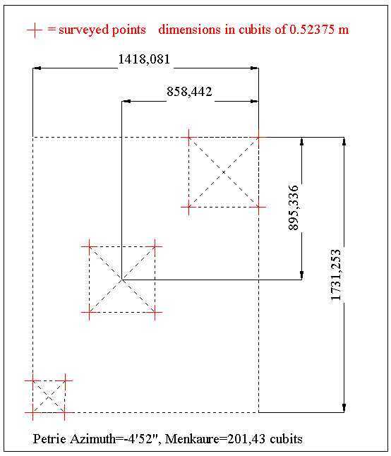 meters. Fig. 1, where dimensions are referred to a Coord. Syst. that sees Due North at + 4'52", or mean azimuth of 2 larger pyramids, is the plan accurately analyzed by John Legon, who firstly noted the geometry embedded into the Giza Complex. |