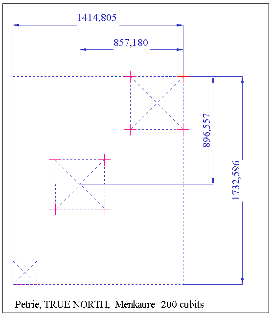 | But if the sqrt(3) x sqrt(2) rectangle drives the placement of the 1st and 3rd pyramid which geometry stands behind the positionning of the 2nd? What 857.180 and 896.557 mean? |